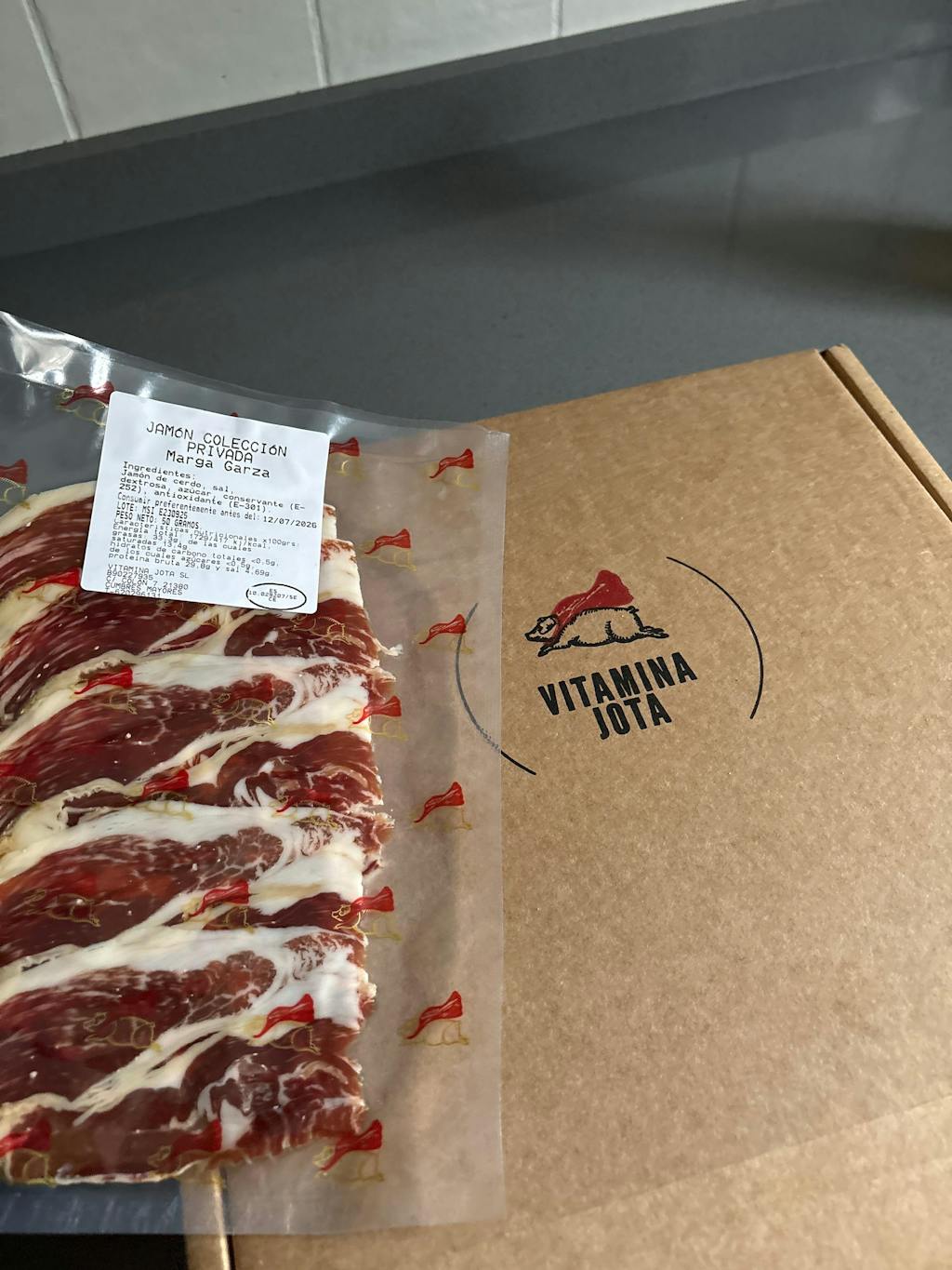 Una caja con los 16 sobres que contienen esta suscripción a jamón del bueno.